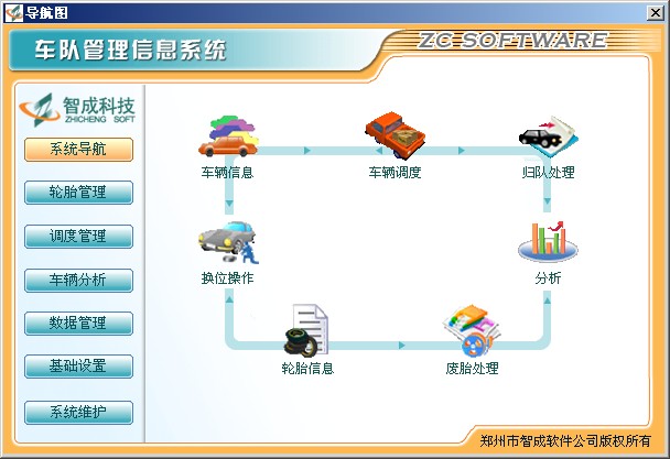 智成软件车队车辆管理系统是郑州市智成软件科技有限公司和朝阳浪马轮胎有限责任历经两年时间在充分调研国内多家大型物流公司车队车辆管现状的基础上, 从物流公司车辆管理的实际出发,针对车辆运营的具体业务特点,结合朝阳浪马公司生产型企业对轮胎的研究与认识, 融合智成公司计算机技术优势和对轮胎行业软件研发多年的背景,运用科学的管理方式将车队工作流程和信息技术相集合, 由郑州市智成软件科技有限公司和朝阳浪马轮胎公司共同研发的一套具有行业特色的车队综合信息管理系统。 该系统安全稳定、功能强大、界面友好、操作简便,通过使用本系统可以有效地实现对物流公司中的核心部分车辆、司机、车辆油耗及轮胎磨损的信息 进行合理有效的管理,及时跟踪车辆、轮胎的使用情况,分析车辆的运营成本(如:司机补贴、车辆维护、车辆保险及事故率、油耗及轮胎使用成本等), 为车队公司领导的管理和决策提供及时、准确的数据信息和理论依据,并达到提高工作效率,节约运营成本的目标。