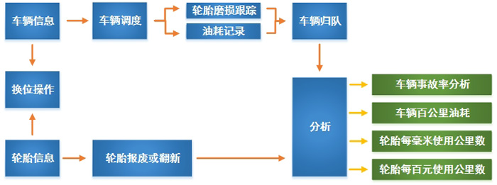 新胎购进、轮胎换位、轮胎报废及轮胎的使用跟踪等。